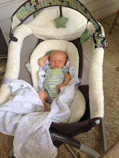 And of course all snuggled up and sleeping. This is where we have been having him sleep in this little carrier pretty much since he was born and it works great. He is a good sleeper and giving me longer stretches at night that Mommy really appreciates.